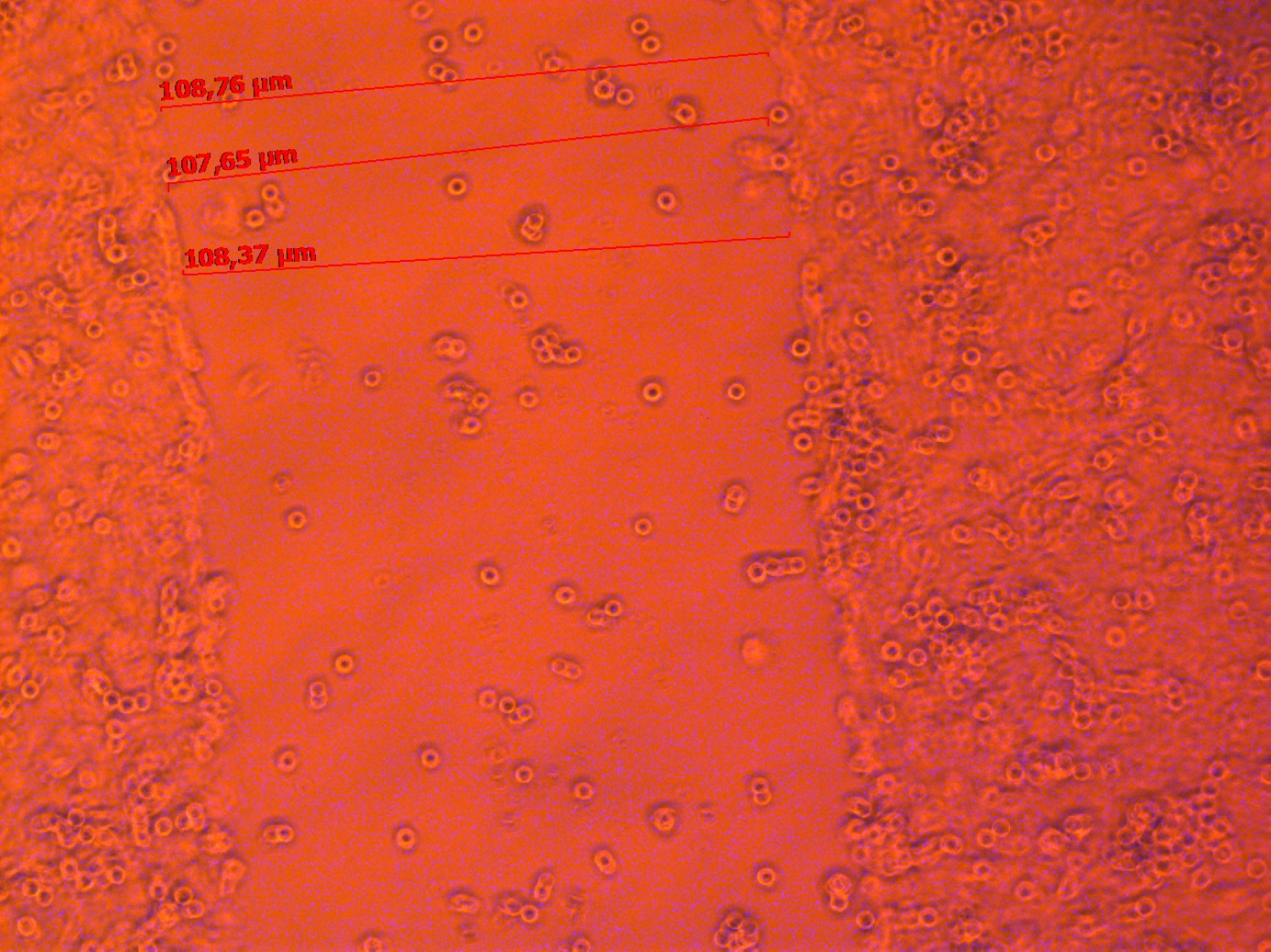 EA.hy 929 cells (gifted by Dr. C.J. Edgel, Caroline University, USA) were grown to 80-90% confluence in a 96-well plate, and incubated in medium containing 1% FCS overnight. EA.hy 929 monolayer were scratched with a 200 μL pipette tip, washed to remove debris and cultured in 100 µL of DMEM containing 10% FCS (positive control), in mixture of 70% DMEM and 30% of conditioned media from BM-MNCs growth in the presence or absence of Epo (experimental wells), and in 100 µL of DMEM with 0% FCS (negative control), the incubated at 370C in CO2-incubator for 24 hours. Images were observed using an inverted contrast microscope (Zeiss, Germany).