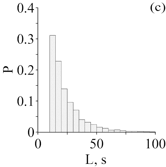 We estimated properties of a sequence of durations (L) of the intervals of the phase synchronization between the LF oscillations in the HRV and the PPGV. A typical sequence L(t) is shown in Figure 2a. The horizontal axis is used to specify the time of the beginning of each synchronization interval and the vertical axis – the number of a subject.