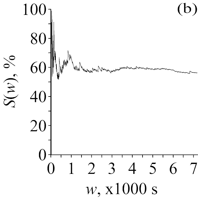 A typical example of the S(w) dependence for subject B is shown in Figure 3b. The fluctuations of the estimation of the index S decrease with the increasing duration of the experimental realization w. At large w, S(w) stabilizes and reaches the saturation level. The values of the index S, at which the S (w) dependence stabilizes, vary in different people. The average saturation value for the ensemble is 59.2±5.8% (data presented as mean with standard deviation), 1th, 2nd and 3nd quartiles are 57.5%, 58.8% and 59.6%, respectively.