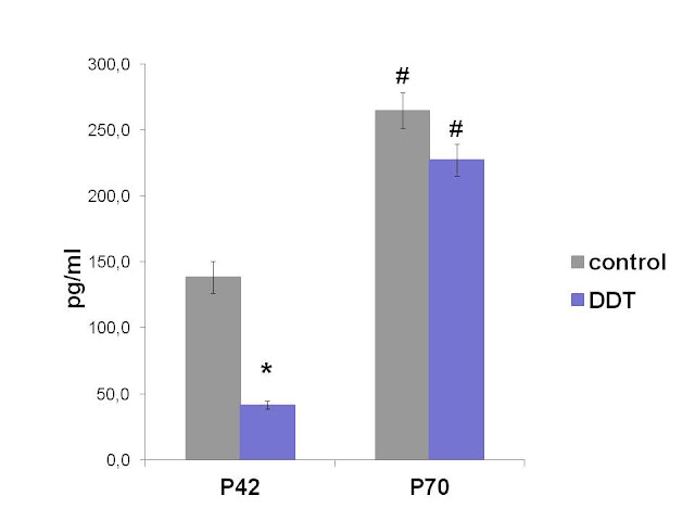 Figure 1. Serum levels of aldosterone in the control and DDT-exposed pubertal (P42) and adult (P70) rats. * – P<0.01 in comparison with appropriate controls; # – P<0.01 in comparison with previous term.