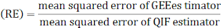 With the formula below, we can compare the efficiency of parameter estimates by GEE and QIF: